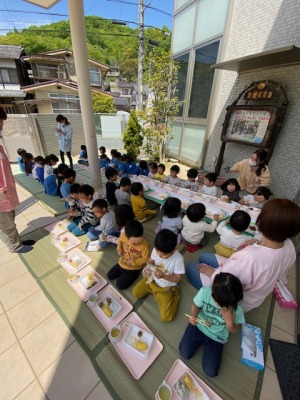 今日、保育園ではふじ組さんが初めてのクッキングをしました。エプロンをつけ、三角巾を被り、一人前な姿でおにぎりを握りました。山やハート、三角といろんな形のおにぎりが出来上がっていました。ゆり組、さくら組さんは、給食先生にお弁当を作ってもらって、みんなで玄関にゴザを敷いて頂きました。ふじ組さんは嬉しそうに美味しそうに、自作のおにぎりを頬張っていました。いい天気に恵まれ、気持ちいいランチタイムでした。