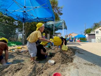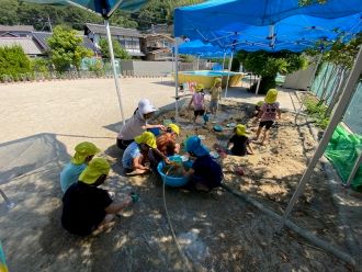 8月も終盤に近づきプール活動も一段落し、今日は3才児さんが砂場でどろんこ遊びをしました。お家から汚れてもよい服とズボンを持参頂き、砂場に水を貯めて、温泉にして浸かったり、山を作ってトンネルを掘ったりと、汚れを気にせずに遊びました。最初は消極的だった子どもたちも慣れてくれば、バシャバシャと水のなかで足踏みをして普段では出来ない感触を楽しみました。もうすぐ9月ですが、しばらくは暑い日が続きそうです。