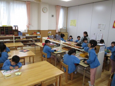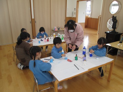 1月もあっという間に終わりです。今日も暖かいので、子どもたちは元気に外で遊んでいます。来月は作品展がありますので、製作も頑張っています。今日は、紙粘土で作ったお雛様に色を塗りました。いろんな形のお雛様にいろんな色が塗られ、ユニークな顔が描かれていきます。お楽しみにお待ちくださいね。