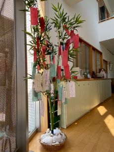 今日は7月7日、七夕です。保育園では恒例の七夕のお話をペープサートで見て、ふじ組、ゆり組さんが楽器の演奏を披露してくれました。保育園の玄関にも子どもたちの願いが笹に揺られています。みんなの願いが叶いますように。そして今夜、織姫と彦星は再会することができるのでしょうか?ちなみに給食はそうめんと星のコロッケでした。