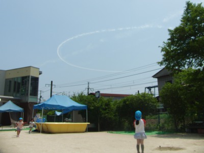 今日、尾道水道の上空をブルーインパルスが飛行しました。園児みんなで園庭に出て、空を見上げ大興奮しました。最後にとても綺麗なハート型を青空に描いて帰って行きました。関係者の皆様、とても楽しい時間をありがとうございました。