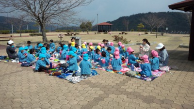 今日、3・4・5才児さんは、ふじ組さんのお別れ遠足に出掛けました。保育園の近くの山道を登って平原の公園まで行きました。少し寒い遠足でしたが、みんなふじ組さんと遊べる最後の遠足を身体いっぱいに楽しんでいました。保護者の皆様、朝早くからのお弁当作りお疲れ様でした。子どもたちはとても美味しそうに食べていましたよ♪